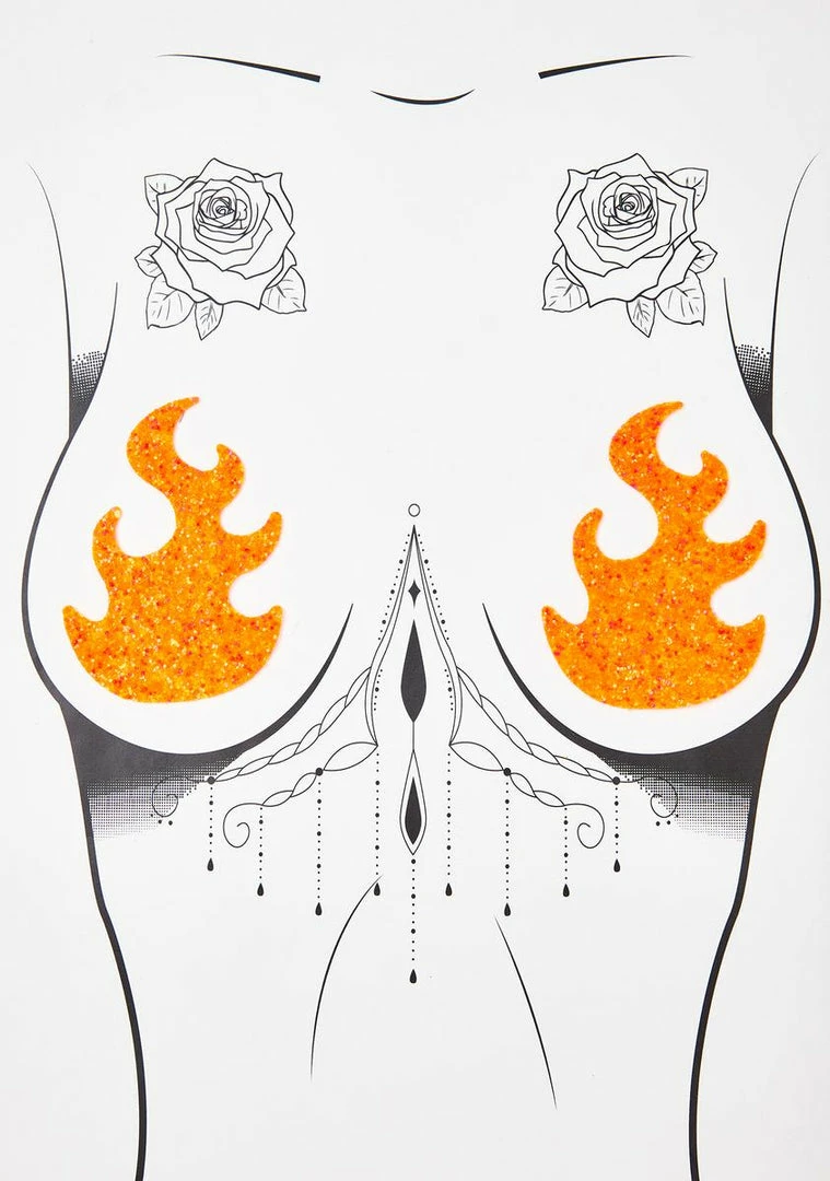 cuz youâre too hottt. Turn it up in these UV reactive glitter pasties with a flame shape and self-adhesive backing.
