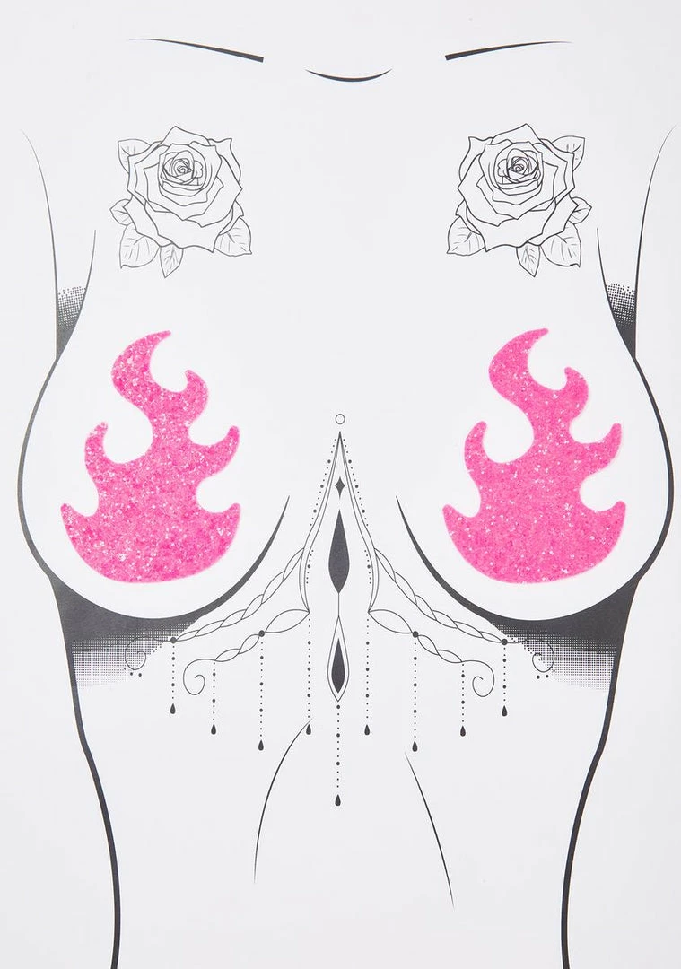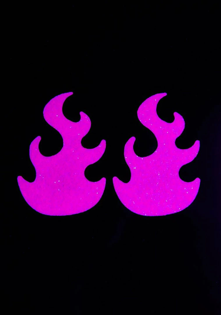cuz youâre too hottt. Turn it up in these UV reactive glitter pasties with a flame shape and self-adhesive backing.