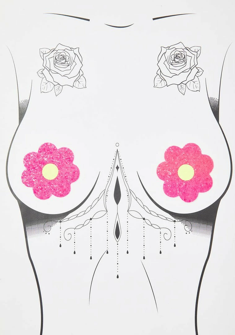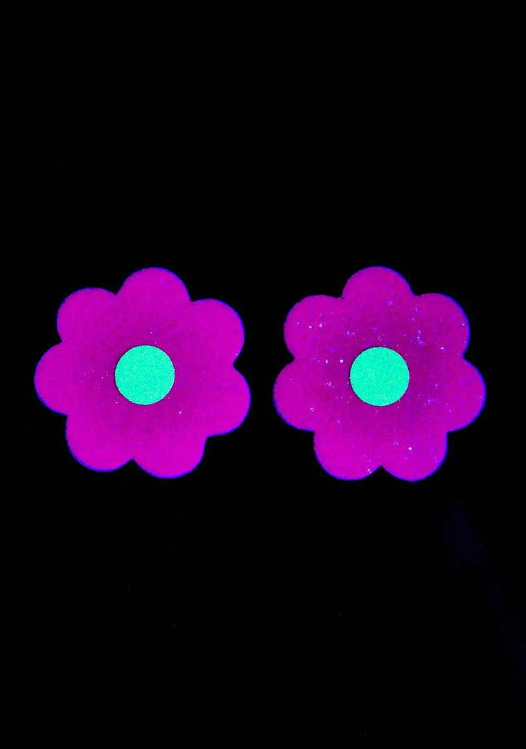 givin em sumthin to stare at bb! Look cute as eva with these flower shaped pasties with tonz of glitter n sparkle on em and a uv reactive finish that glows under a black light!