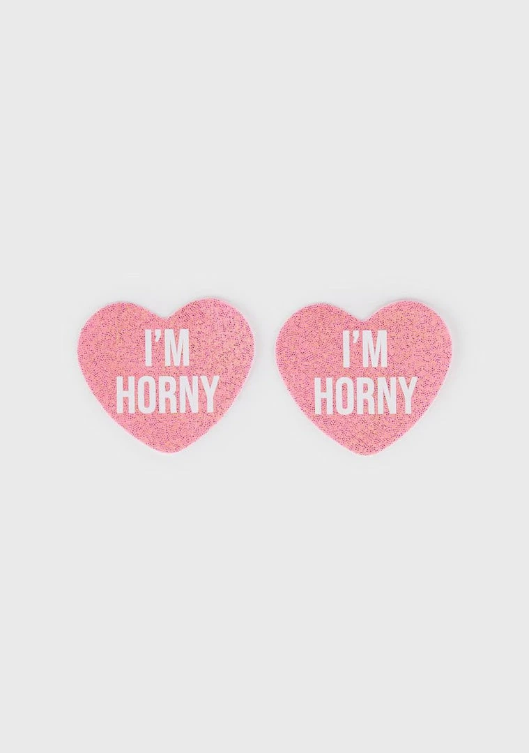 drop a subtle hint. These pasties come in a glitter heart construction, with an i’m horny text print.