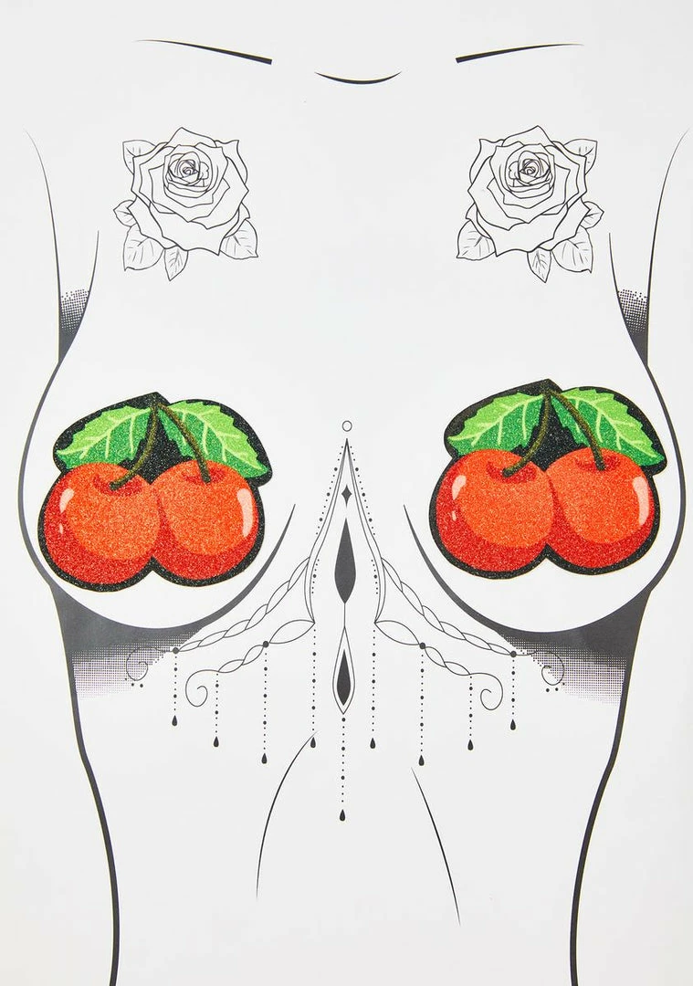 got âem begginâ for a taste, babe. Ya keep it juicy in these sweet pasties that have glittery cherry designs and adhere easily Nâ safely to the skin.