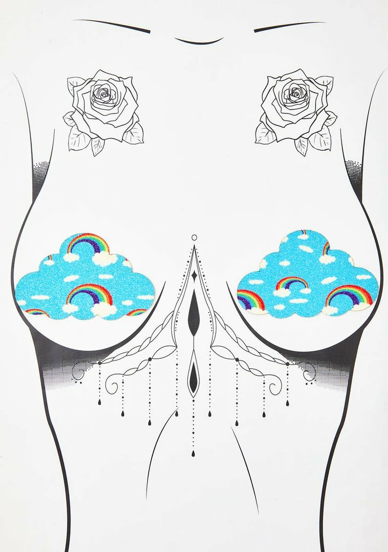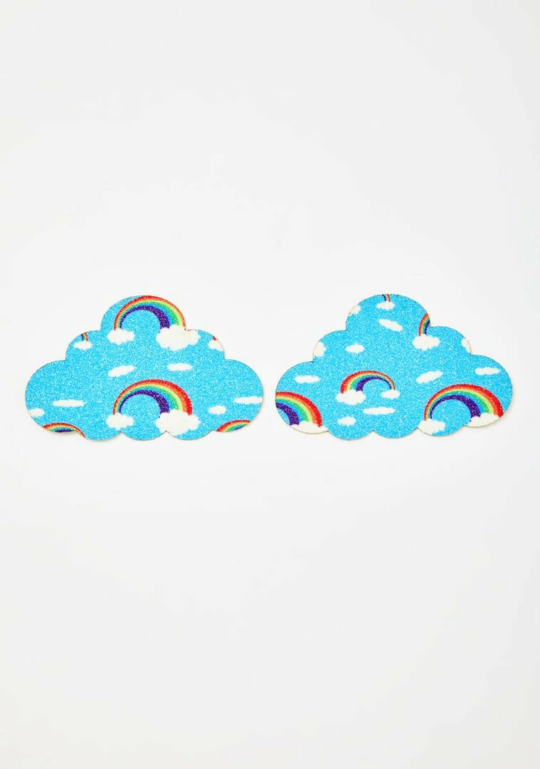 somewhere ova the rainbow is you, bb! Yer our lucky pot of gold in these adorable cloud-shaped pasties that have lil rainbows all ova and adhere safely and easily to the skin.