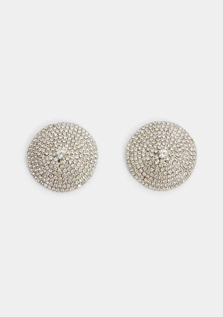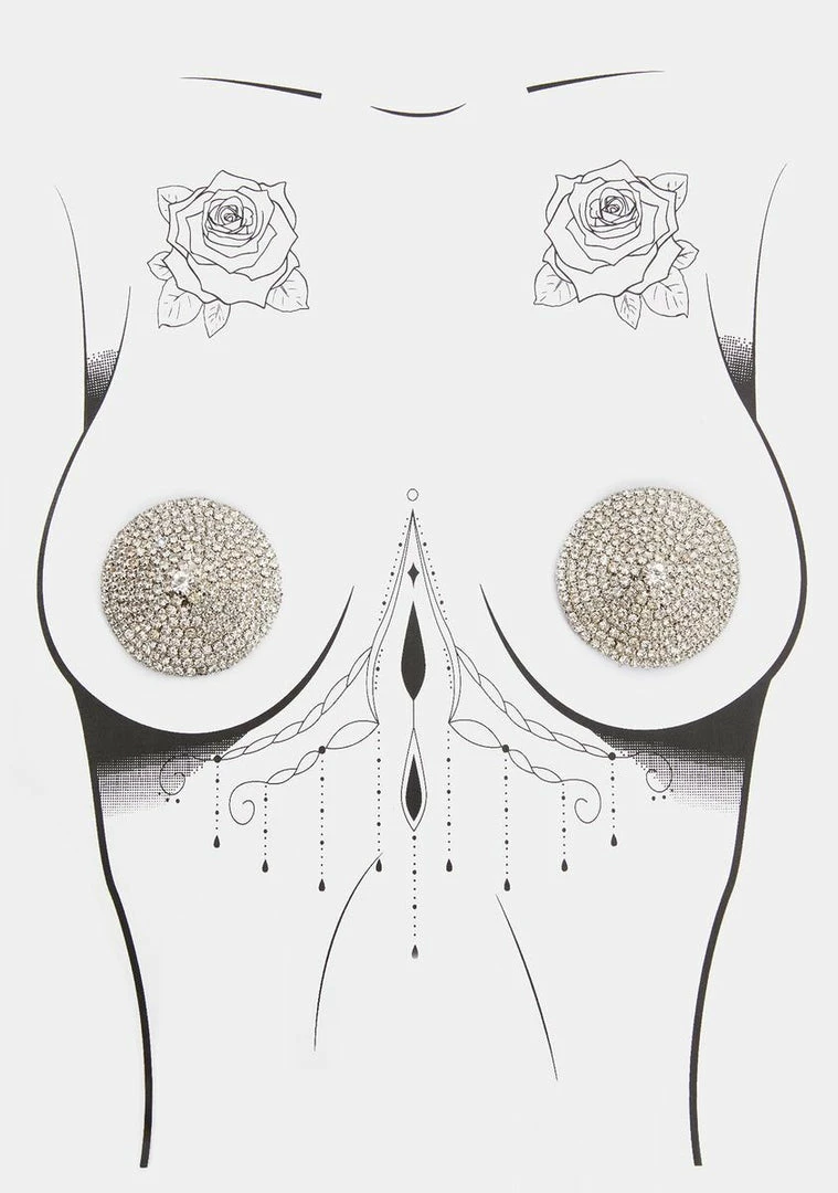 because youâre shining bright tonight! These icy pasties come in a circle shape covered in rhinestone crystal gems and have a skin-safe adhesive backing that allows them to be worn again and again.