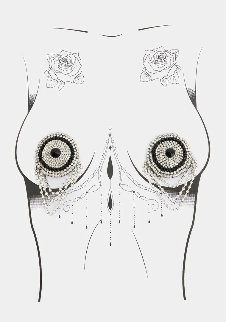 because youâve spotted your next target. These reusable circle-shaped pasties have an icy rhinestone pattern on them and draped fringe at the bottom.