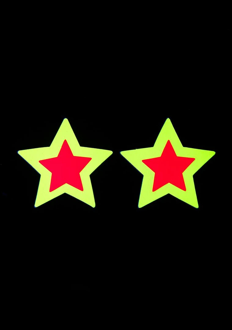 letâz nip it in the bud already. These handmade star shaped pasties have a neon yellow outer edge that will glow under black light.