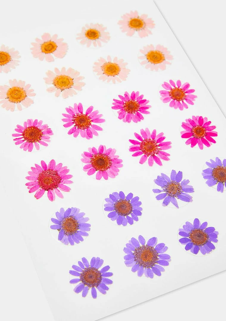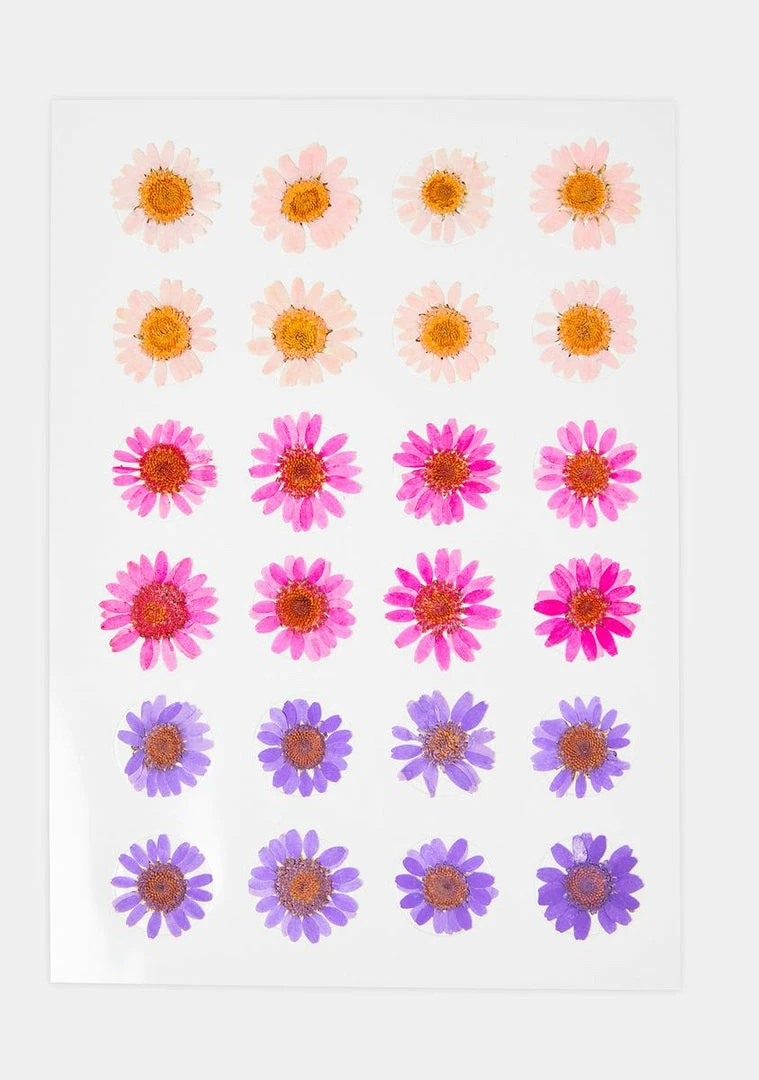 includes a sticker sheet of multi-colored pressed flowers that can be applied on the face or body.