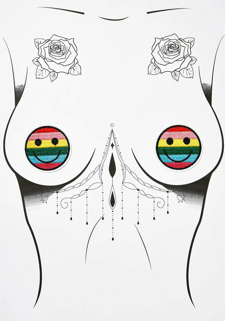 cuz letâs roll up and get away babyyy! Play make believe in these dope embroidered DIY rainbow smiley face pasties that you just cut, adhere, and stick to look fabulous AF all night long!