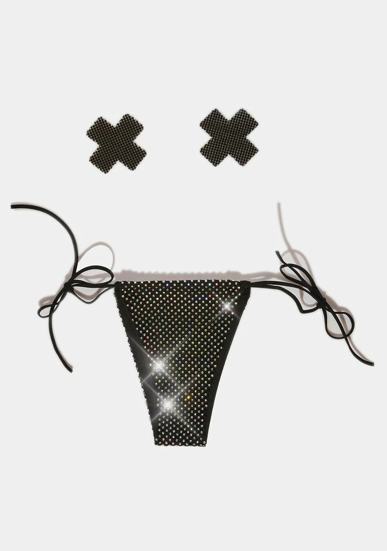 comes with a pair of rhinestone X-shaped pasties and a matching panty with side tie closures.